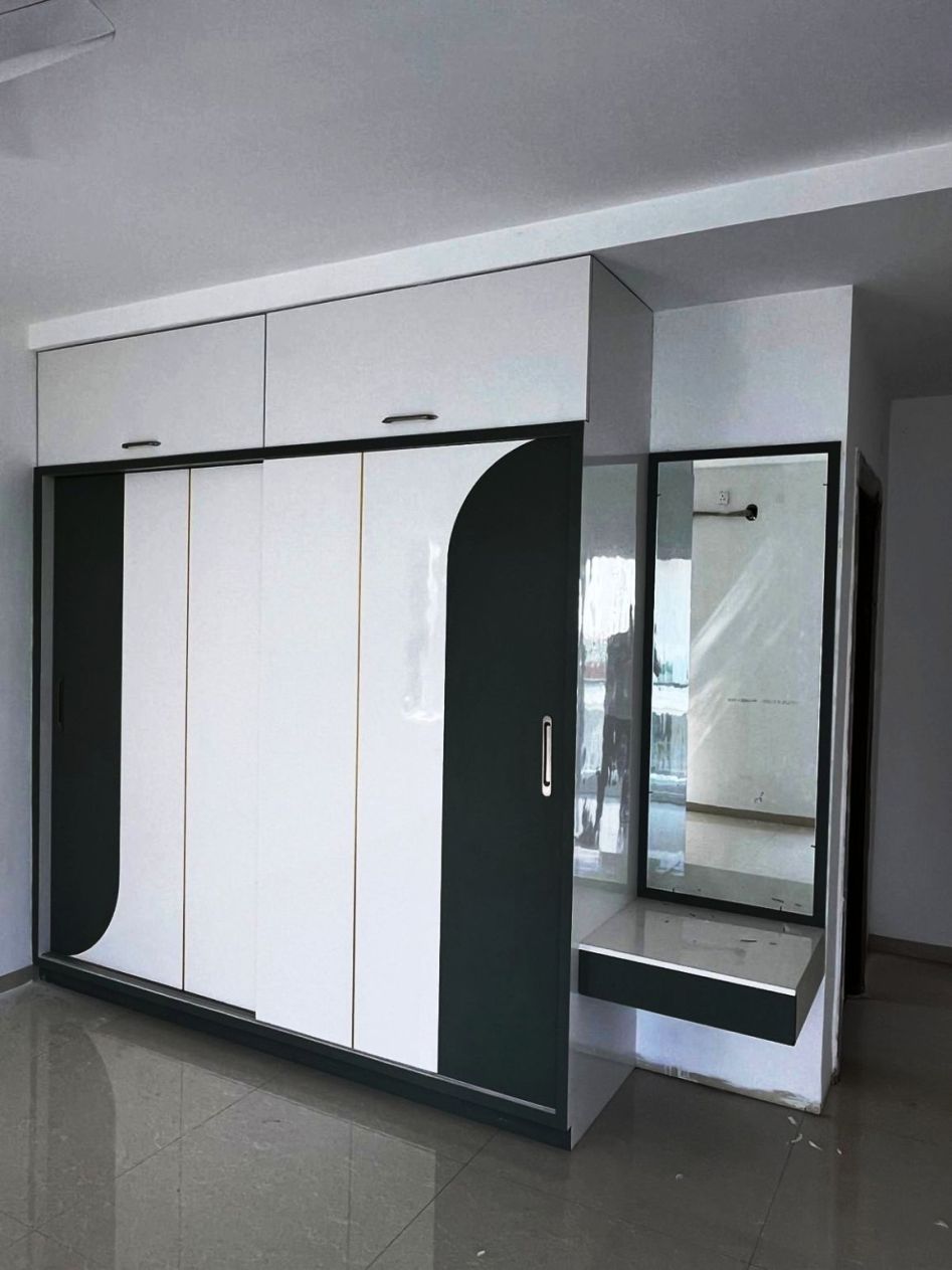 Wardrobe Interior Design focusing on modern workstations, ergonomic seating, open layout, natural lighting, and creative accents to boost productivity while maintaining a professional atmosphere.