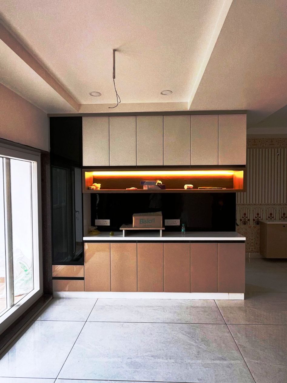 Modular Kitchen with Custom Design including functional built-in storage, soft lighting, minimalist décor, and a modern theme, creating a serene and organized personal space.